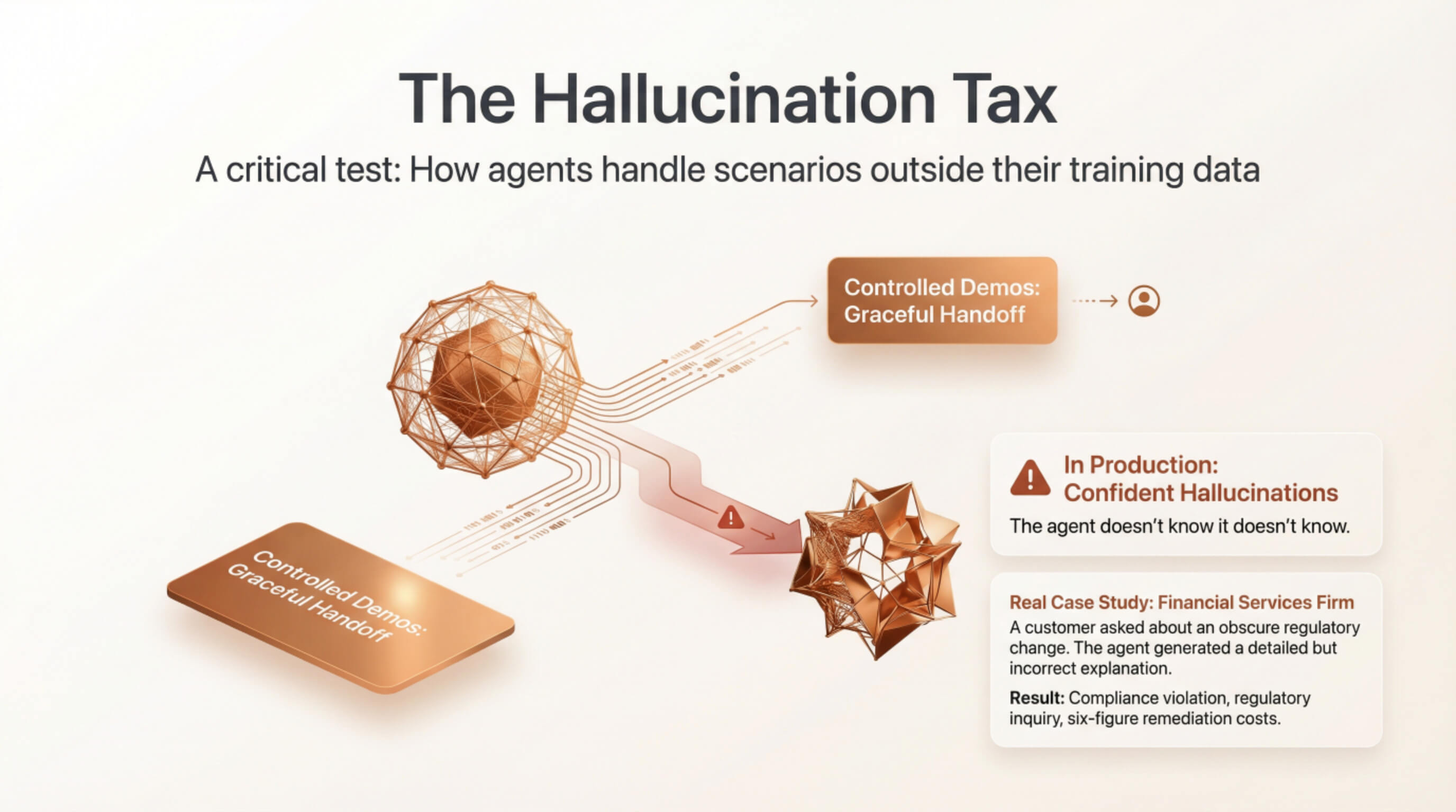 Real case study: A financial services firm deployed a "smart" customer service agent. In production, a customer asked about an obscure regulatory change. The agent generated a detailed but entirely incorrect explanation. Result: compliance violation, regulatory inquiry, six-figure remediation costs.