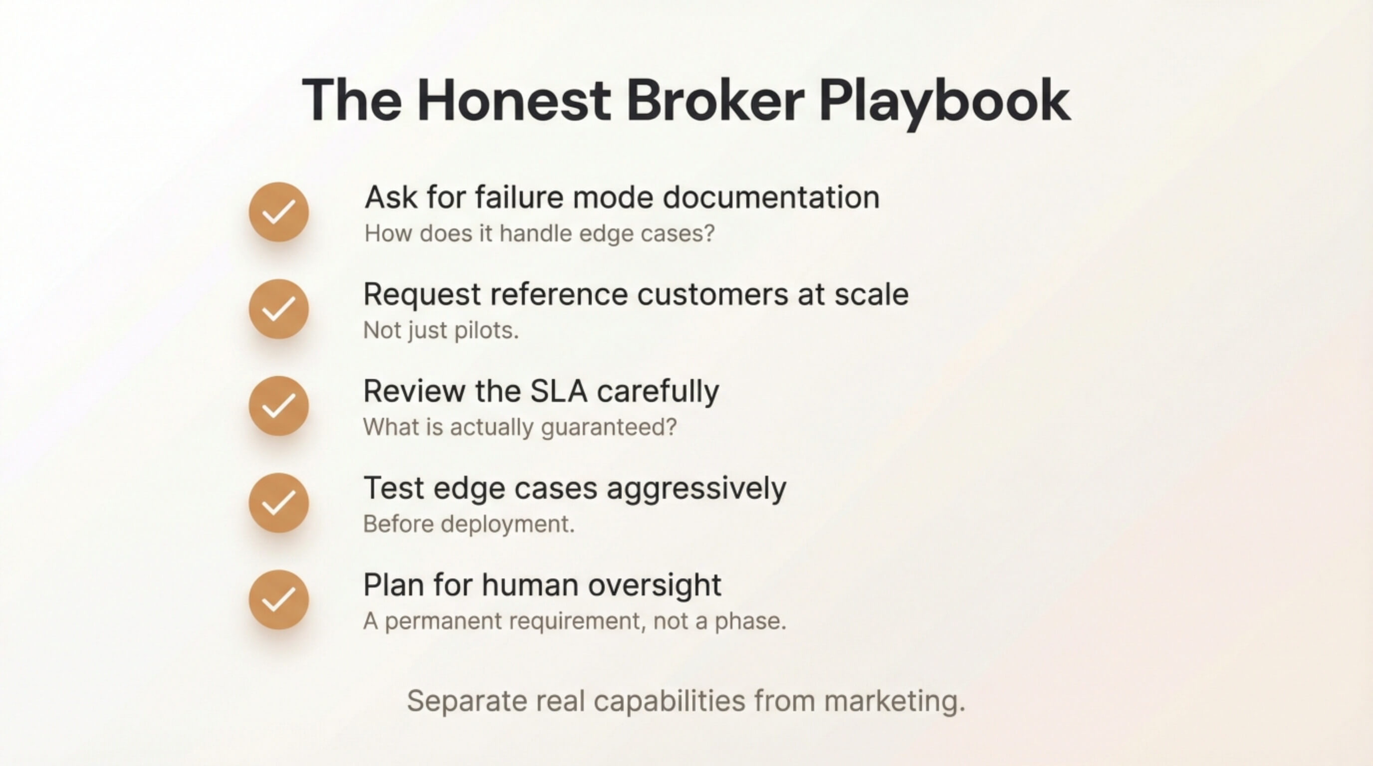 Here is a test every buyer should run: ask the agent to handle a scenario that was not in the training data, then observe what happens when it is uncertain.