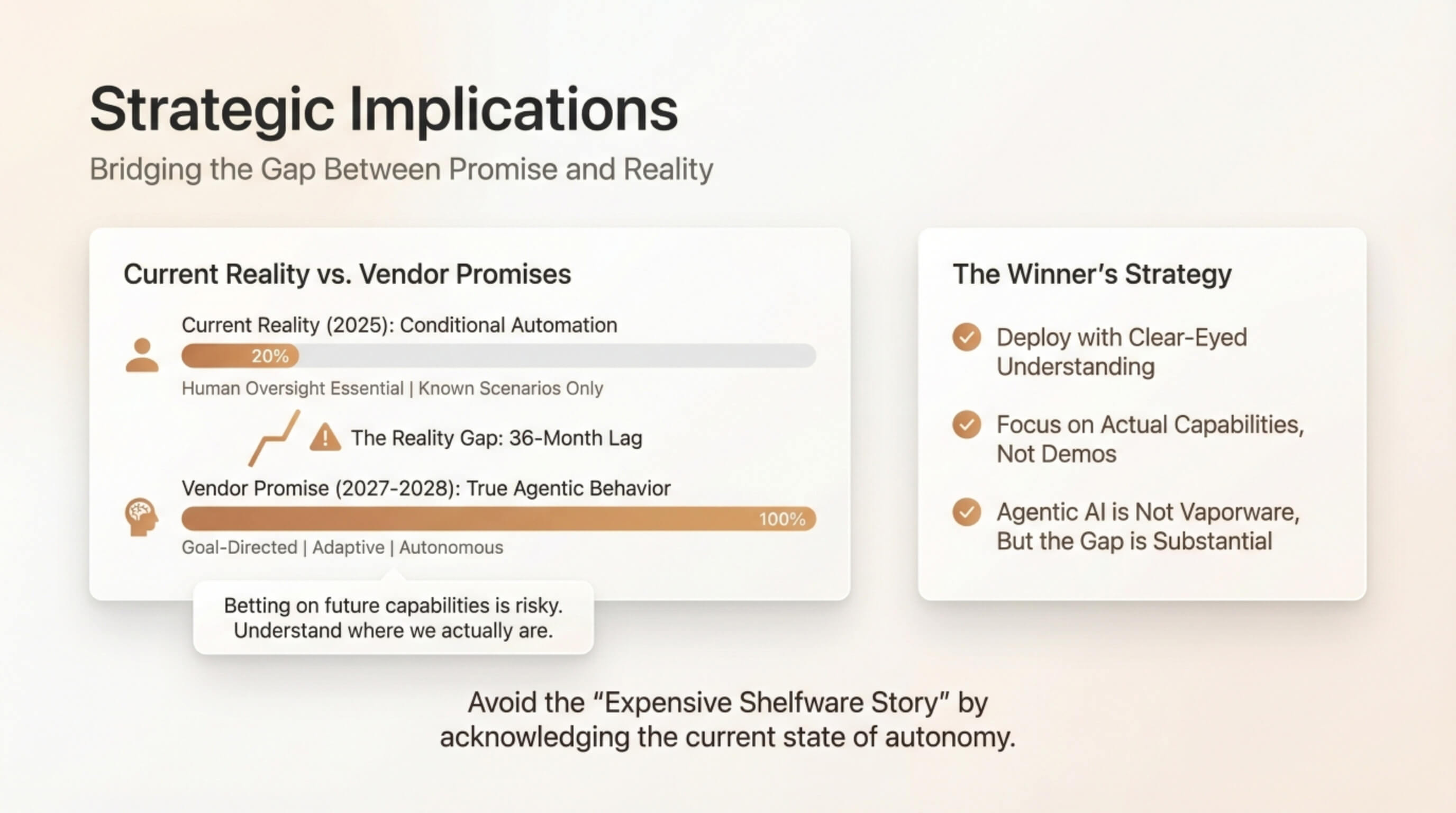 The problem is not that these tools are useless. It is that buyers are making strategic bets based on capabilities that do not exist yet — and will not exist reliably for another 18-36 months. Understanding where we actually are on the autonomy spectrum is not just academic. It determines whether your AI investment generates ROI or becomes another expensive shelfware story.